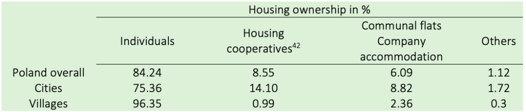 The ownership structure of housing is a characteristic feature of Poland (and other Central and Eastern European countries): only 20 per cent of flats involve flats for rent and 80 per cent concern private property.[4]